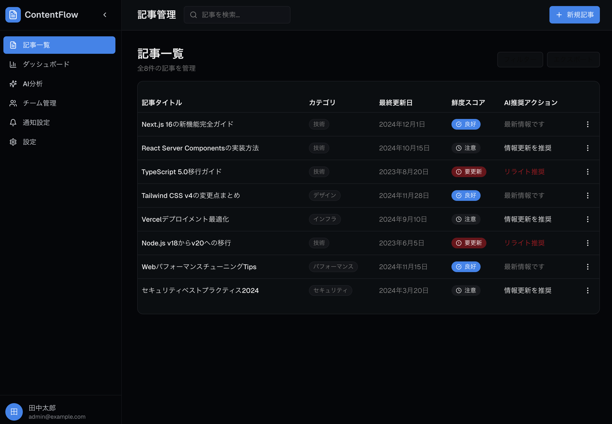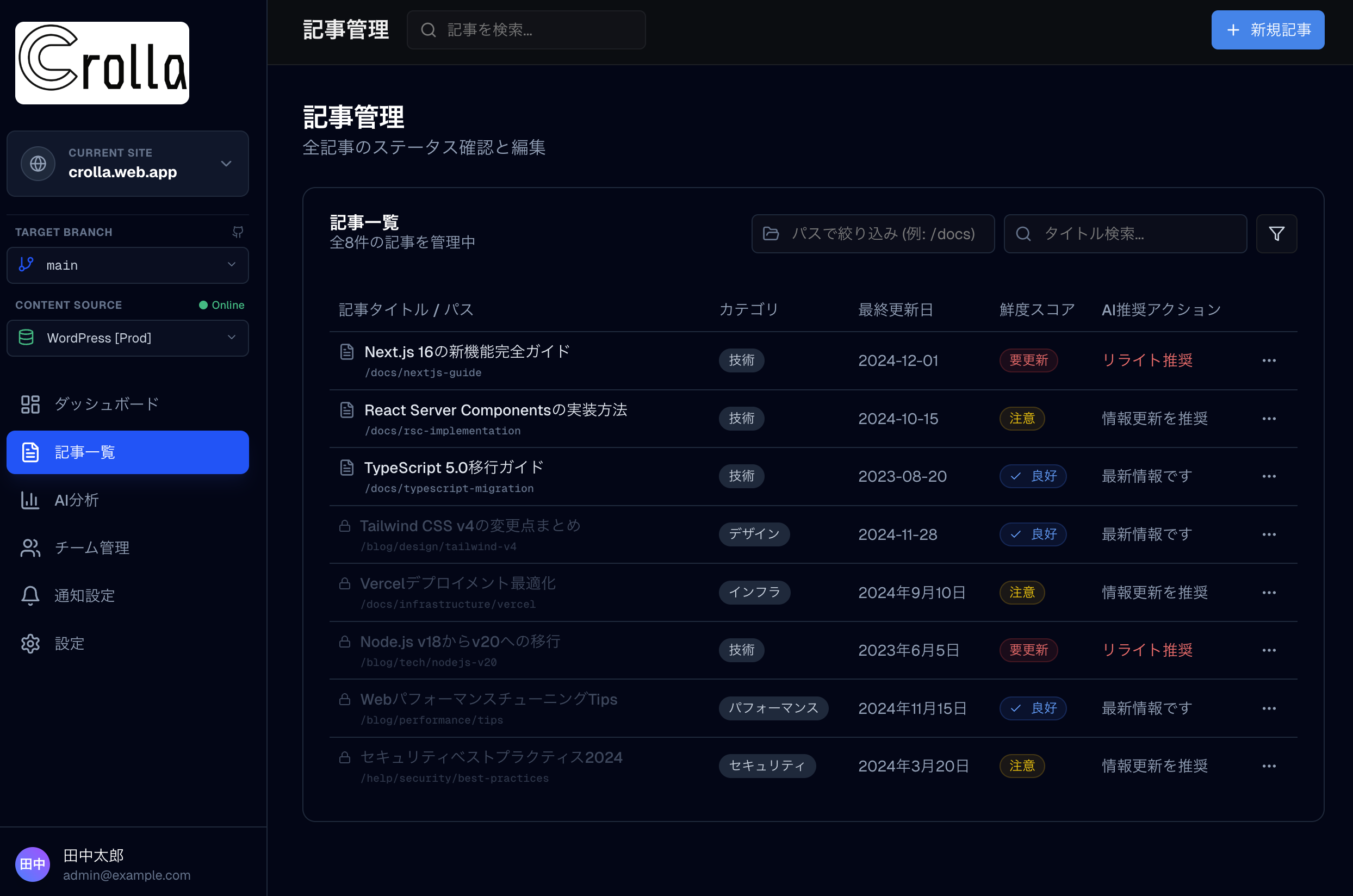AIがサイト全体を自動巡回し、古い情報やリンク切れを洗い出します。